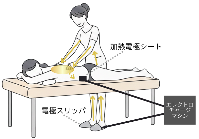 ReCHARGEの最大の特徴は、マシンから発せられる特殊低周波を、施術者の手指を介して直接お客様に届ける「エレクトロチャージ・ハンドトリートメント」にあります。