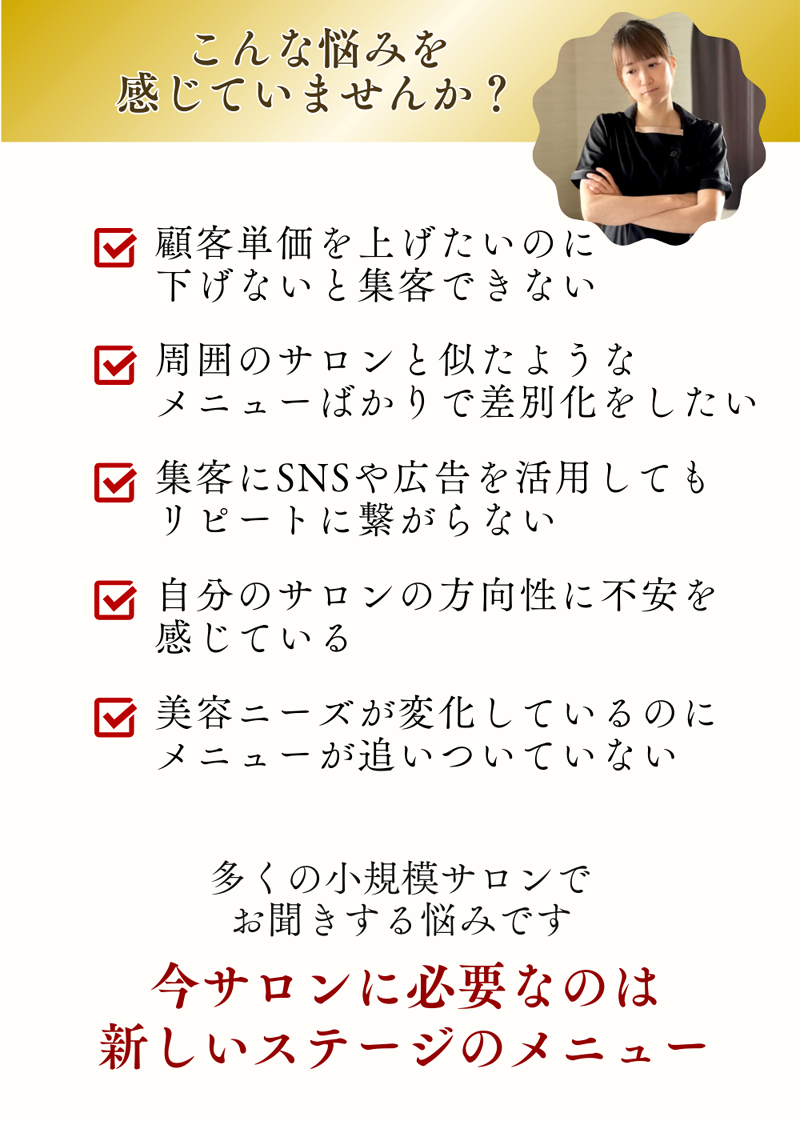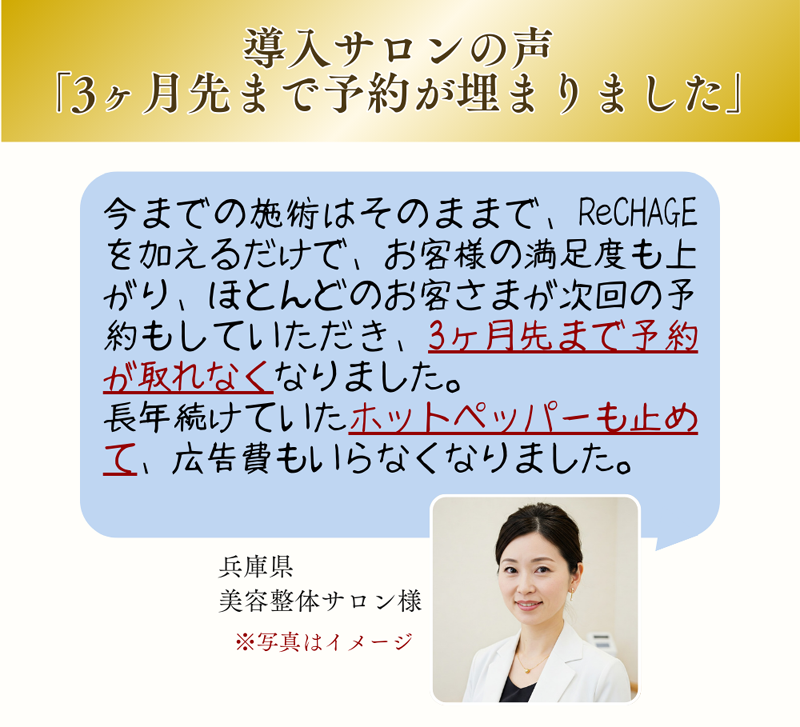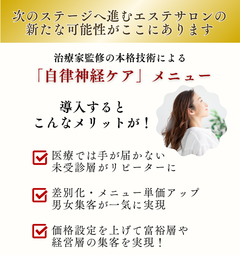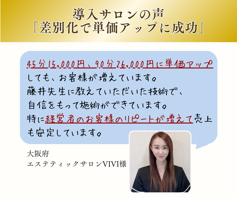 A.この施術は“健康管理を意識する層”に響く内容で、価格競争に陥りにくい特別なメニューです。導入サロン様では単価15,000円前後で提供され、富裕層・経営者層の新規獲得に成功しています。