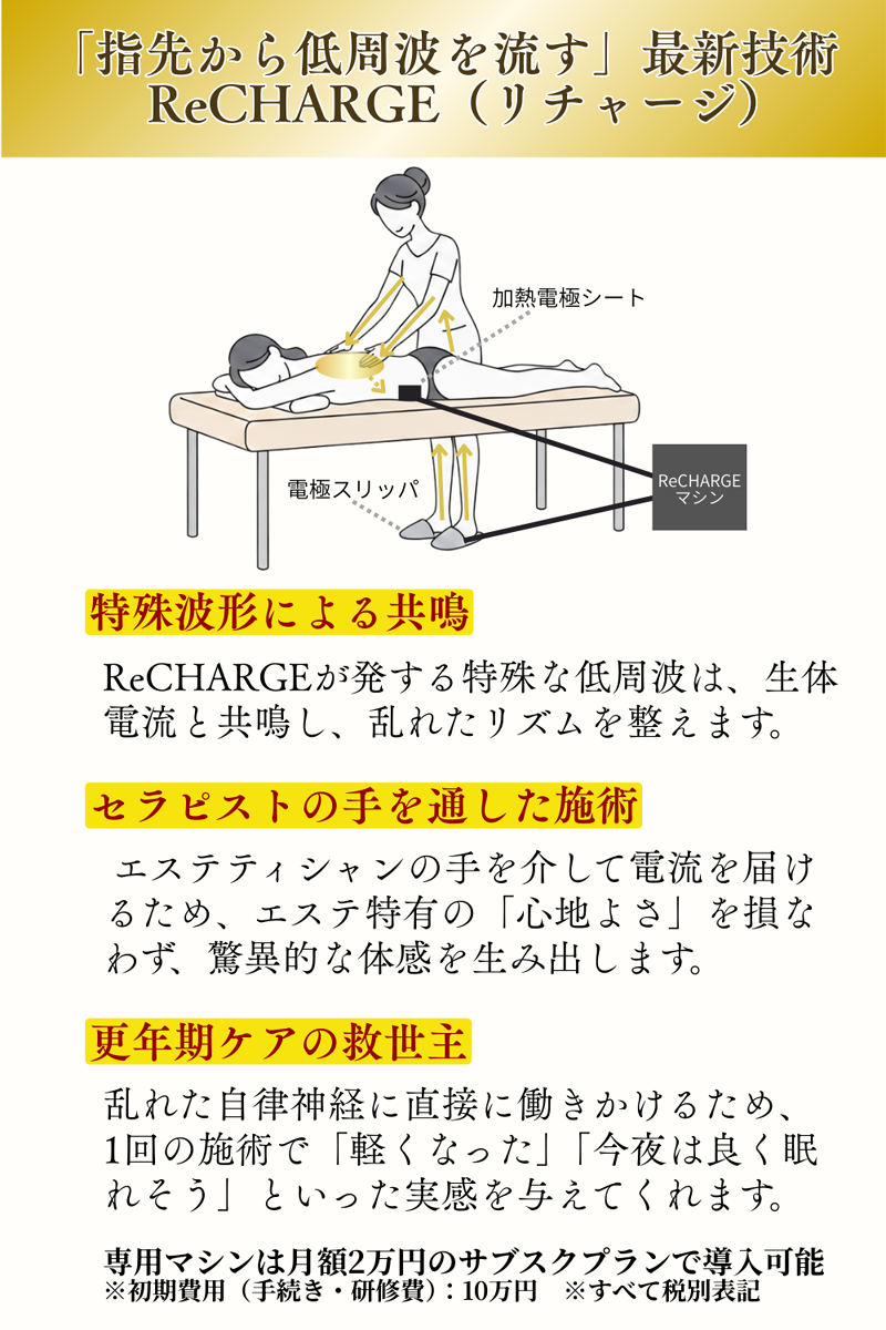 A.専用のエレクトロチャージマシンを用いた施術です。手技に加え、独自の低周波を体内に流すことで、自律神経やホルモンバランスを整え、深いリラクゼーションと体調管理を実現します。
